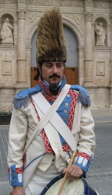 Subteniente abanderado con la enseña coronela. Gastador. Tambor de granaderos.