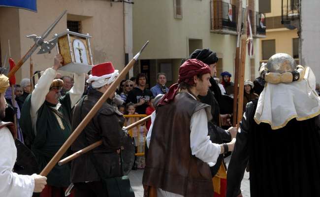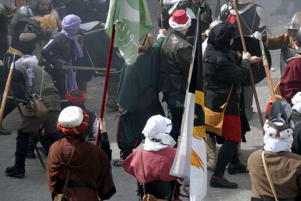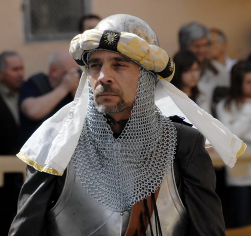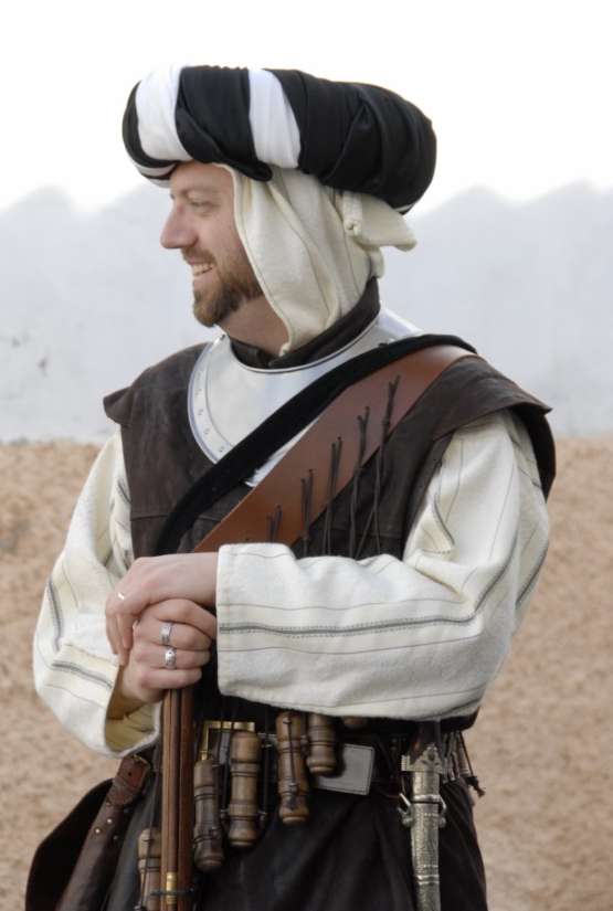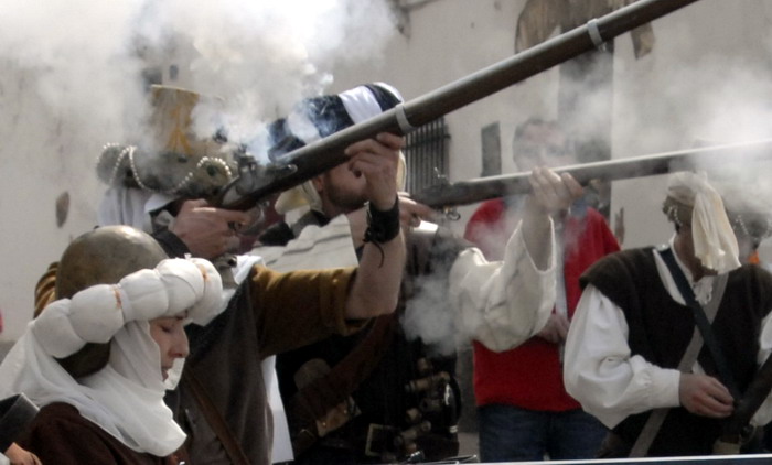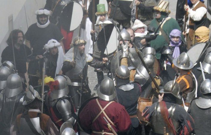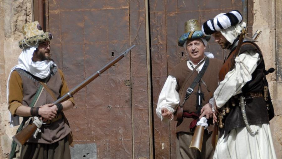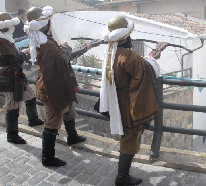 Tropas de Selim Al-Manzur enfrentándose a los imperiales del duque de Segorbe durante la recreación de la Guerra de Espadán. Estos guerreros musulmanes estaban bien entrenados y armados y, además, tenían experiencia de combate, ya que unos pocos años antes habían luchado en la Guerra de las Germanías como vasallos en las huestes de los señores valencianos enfrentadas desde 1519 a 1523 a los "agermanados". Aunque las costumbres y el aspecto eran bien distintos, las armas empleadas por ambos bandos en la Guerra de Espadan eran muy similares.