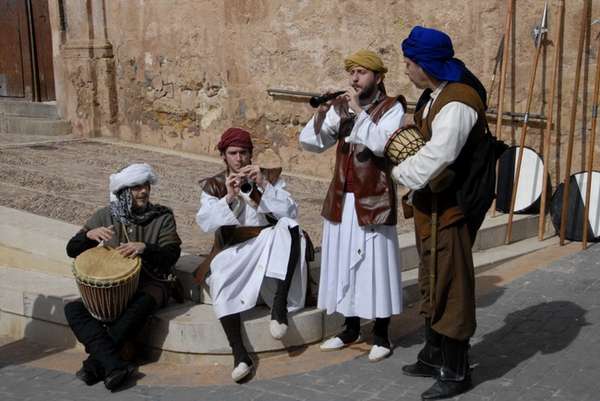 Civiles mudéjares. A la izquierda unos niños y a la derecha un grupo de músicos con sus típicos instrumentos de origen árabe. Al igual que sucediera 80 años mas tarde durante la expulsión de los moriscos de 1609, en la revuelta de 1526 la población musulmana de algunos puntos del Reino de Valencia también se implico en los combates, incluidos las mujeres y los niños.